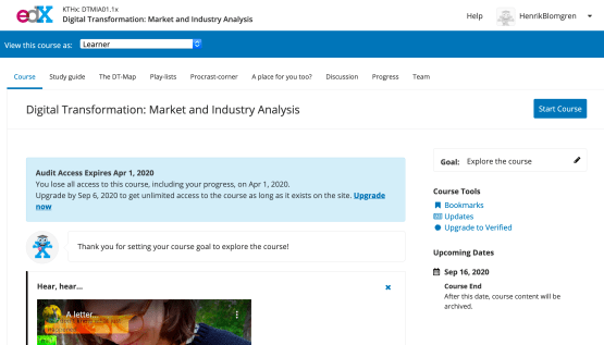 Below you find a picture of the “manouver-panel” within a course on EdX I run (called Digital Transformation: Market and Industry Analysis). This is the view you meet the first time you enroll in this course.