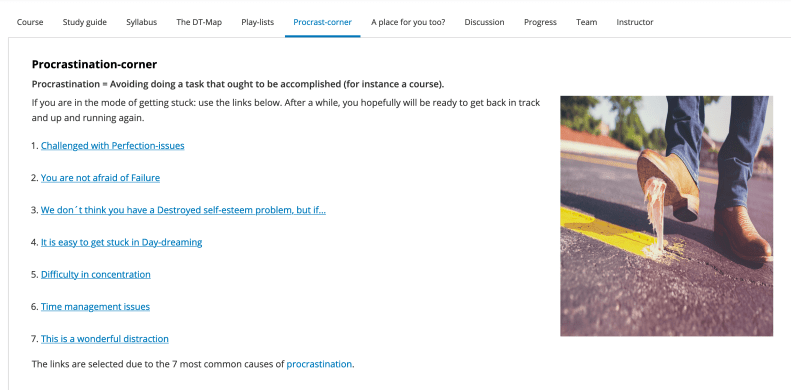 In this course you find pages called “The DT-map”, “Play-lists”, “The procrast-corner” as well as “A place for you too?” (picture below). People do click on them just to get an overview of the course.