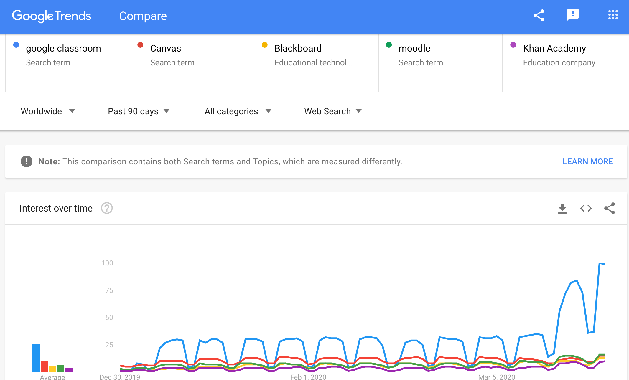 Google Classroom, Canvas, Blackboard, Moodle and Khan Academy have grown recently. We probably see Corona-effects here. But Google Classroom is growing far more than the others. Is Google doing something specific at this moment? I don´t know. But it would be interesting trying to figure out if they are.