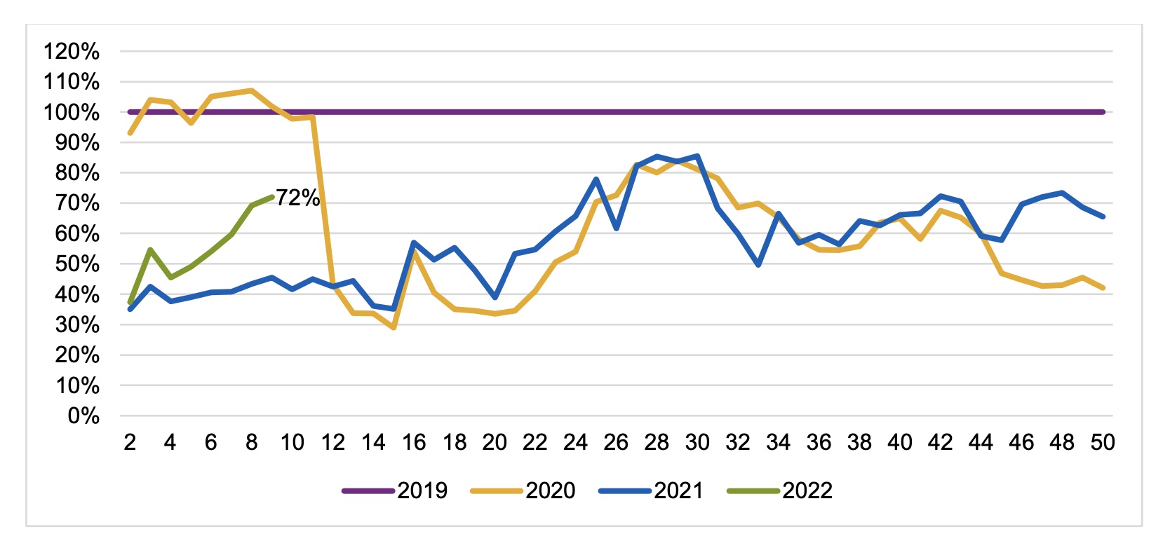 These curves might indicate that traffic is now increasing at campus, week 2-9 this year, 2022. March; 72 % compared to before the pandemic. Are we now, but just with a delay, getting closer and closer to getting back to how things did look before the pandemic? Or, do we trick ourselves when assuming this curve going up? Week 2, 3 etc is after New Year and it normally takes some time to put universities in Sweden up to speed after holidays.